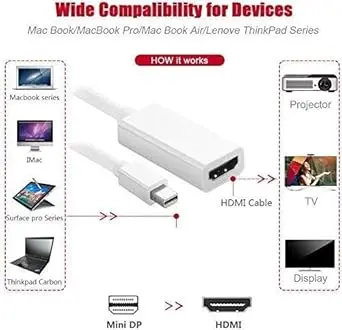 This Mini DisplayPort to HDMI adapter allows you to connect your computer to HDMI display, TV, projector or monitor via the mini DP interface. Easy to use, plug and play, no application required.