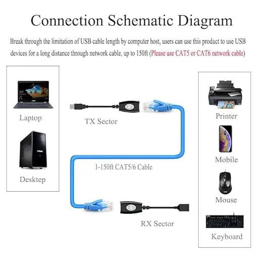 • Extend USB Connection Up to 150 Feet: This USB to RJ45 extender adapter allows you to extend USB signals over long distances using a standard Cat5/Cat5e/Cat6 Ethernet cable Plug & Play Setup: Simple installation with no software or driver needed, making it convenient for quick USB device connectivity Compatible with Multiple USB Devices: Works seamlessly with printers, webcams, keyboards, mice, and other USB peripherals over long distances Stable Signal Transmission Without Interference: Ensures high-speed, reliable USB data transfer without loss or delay for home and office setups Durable Build for Long-Term Use: Atevon's USB extension over RJ45 adapter is built with high-quality materials to ensure lasting performance and durability