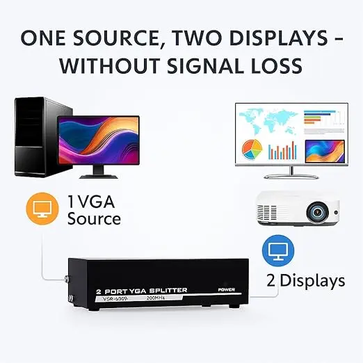This video splitter is compatible with 95% of the monitor on the market and enables up to 64 monitor to share the information of a host computer simultaneously. All that needed to operate the system is a personal computer (with VGA card), cables, a power adaptor and the monitor splitter This video splitter are boosting devices that duplicates the video signal from any analog monitor source to 2,4 or 8 outputs. Broadcasting video information (news headlines, stock prices, airline and train schedules etc) to public Monitoring harsh work environment from safe location Classroom or Company training facilities To achieve multiple High quality VGA, SVGA, or video signal over long distance, these video splitter are your best choice
