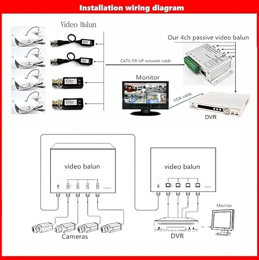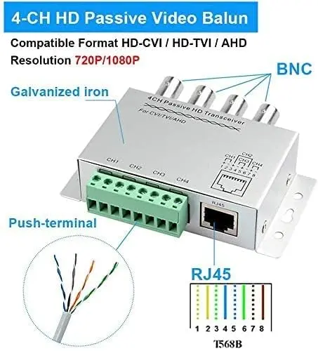 • Upgraded 8MP Mini CCTV BNC Passive Video Balun supports 720P, 960P, 1080P, 3MP, 4MP, 5MP HDCVI, HDTVI, CVBS, and AHD video transmission. Compatible with UTP CAT5/5E/6 cables, offering up to 400 meters transmission distance for AHD/CVI devices and up to 200 meters for TVI. Push-terminal channel passive HD transceiver with a male BNC connector allows direct connection to TVI, CVI, AHD, or camera systems, with gold-plated BNC for better transmission quality over long distances. 8MP Split Joint Mini CCTV BNC HD-CVI/TVI/CVBS/AHD Passive Video Balun Transceiver for Coax to UTP Cat6 connections, supporting HD 720P and 1080P CCTV.